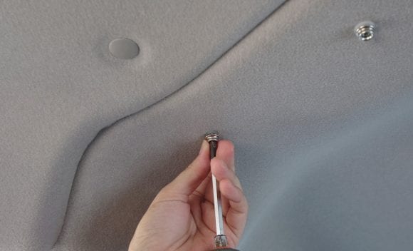商品には車種専用の取付説明書が付属します。基本的な取付方法は、まず、天井にカーテンを固定するためのホックを取付けます。穴あけ加工をした箇所にトグラーと呼ばれるパーツを差し込み、そこにホックをビスで固定します。
