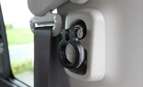 ハイエース・キャラバンなどのトランスポーターの折り畳み式後部座席の台座パイプを利用して装着。タイダウンなどを掛けるクランプフック。ボルト2本で締め付けるだけの構造だから、面倒な手間もなく簡単装着。