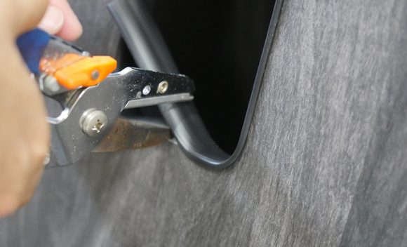 内側の曲面(アール)に打ち込みむ際も、同じようにモールに切り込みを入れることで曲面が綺麗に仕上がります。
