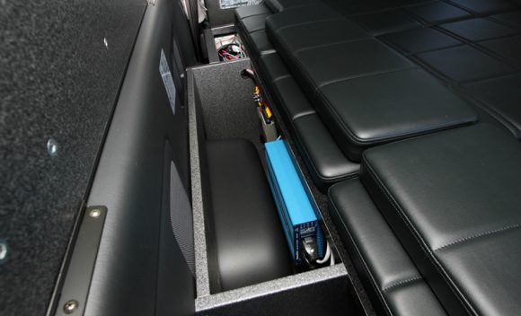 荷室スペースに装備したのは、手締めのボルトで簡単に装着することができるESフラットベッド。ベッド下にサーフィンで使用した濡れたギアを入れておくバケツが出し入れできるように高さを調整してオーダー製作しました。また、サーフボードや体を洗うための水を入れたポリタンクをボックスに固定できるようにベルトを装着しています。