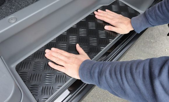 キャラバンのステップを簡単にドレスアップできる「ESステッププロテクター」。縞鋼板で作られたパネルは、ステップをワイルドでオフロード感のある力強いイメージに変貌させます。もともとのステップは樹脂製で、そのままだと乗り降りする際に足をかけるステップは時間の経過とともに傷が付いたり、すり減ったりしてしまいます。そこでこのESステッププロテクターを装着すれば、傷が付いたりすり減る心配もなくステップを保護することができます。