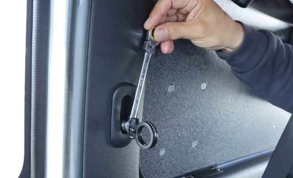 バイクや自転車を積載する際に、この位置のフックの固定が安定した積載に役立ちます。床面へのフックの増設が難しい場合などに、気軽に取付けられるのでお勧めです。ESマルチフックとの組み合わせで、使用していない時の「カチャカチャ音」がしない仕様になっています。