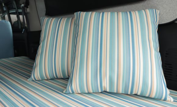 ESフリップベッド boxystyle Design仕様と同じ表皮を使用したクッション。車内でリラックスする際や、就寝時の枕として使用していただけます。車内のアイテムをboxystyle Design仕様で揃えればインテリアのコーディネイトにも一役買いますね。