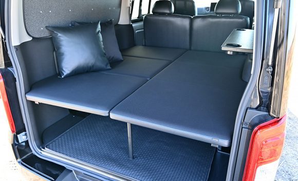 ESタフスペックコンセプト仕様のフリップベッドは、車内での快適性を重視し、既存のESフリップベッドよりベッド高を4cm低く設計しています。ベット上の空間を広くしたことにより、車内で過ごす際の居心地の良さを高めています。また、助手席側のベッドマットを3分割することにより、仕事に、遊びにと、さまざまなシチュエーションで使い分けれるようになっています。