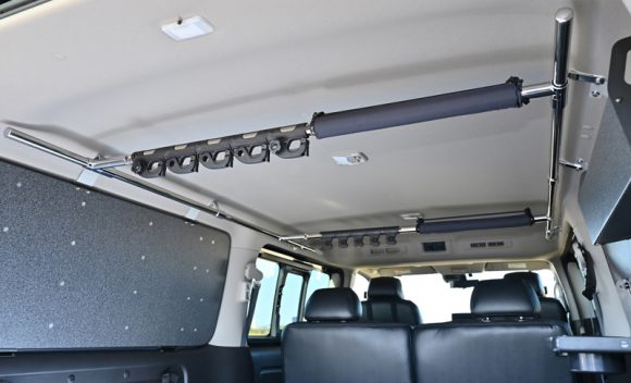 釣りを楽しむユーザーには欠かせないロッドホルダー。当店人気のESサイドマルチパイプラックとESロッドアタッチメントを組み合わせることで、デッドスペースとなる天井部分に、5本のロッドを積載することができます。ロッドの長さに合わせて前後の位置も調整可能です。また、ロッドホルダーの高さは無段階で変更することができ、使いやすい高さに調整して装着することが可能です。