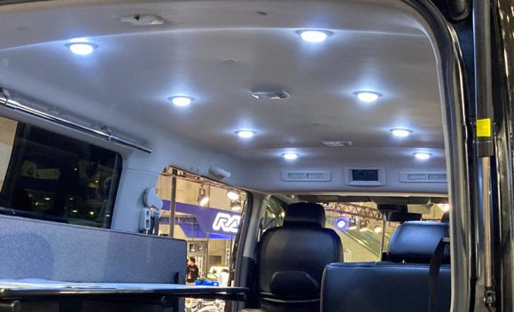 天井にはLED8連スポットライト(3路スイッチ付き:運転席、リアゲート側からオンオフ可)、さらにバックドアにはLED2連ポットを装備し夜間の荷下ろしにも便利です。