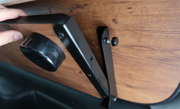 使わない際に折り畳んで収納していただく事が可能です。折り畳んでいる際に、テーブルが展開してしまわないように、固定ボルトが装備されている為走行中に気になる事はありません。普段は折り畳んで収納しておくことで、テーブルが邪魔になることはなく、そこを荷物の積載スペースにしたりとスペースを有効に活用できます。