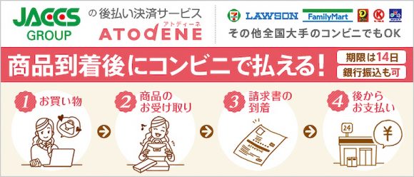 後払い(アトディーネ)決済とは、商品の到着を確認してから、「コンビニ」「銀行」で 後払いできる安心・簡単な決済方法です。請求書は、商品とは別に郵送されますので、発行から14日以内にお支払いをお願いします。また、後払いでのお支払いには、手数料が別途220円(税込)かかります。