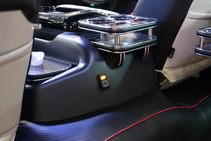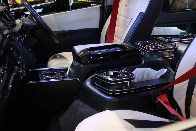 ハイエース、キャラバンのカップホルダーとして定番のLEGANCE インテリアカップホルダーや、コンソールパネル、インテリアパネル、シートカバーに至るまで、インテリアをかっこよく、オシャレにする様々なアイテムが装着されていました。