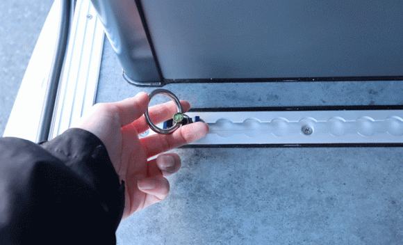 荷室の鉄板部分などにタッピングビスやボルト&ナットでレールを固定すれば、欲しいときに欲しいところへ別売りのワンタッチリングを取り付けて、ベルトなどで荷物を固定することができるようになります。