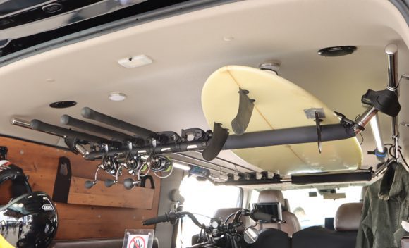発売以来、トランポに欠かせないアイテムとして人気を保っています。ウェアや小物を掛けたりと、トランポに欠かせないアイテムになること間違いなしです。取付けはルーフサイドに埋め込まれている「ラゲッジユーティリティナット」を使用するため、加工することなくボルトオンでの取付けが可能です。標準のESサイドマルチパイプラックよりパイプ長を600mm長くした「1800mm」タイプを取付けたことで、オプションパーツの可動域を増やし長さのあるロッドやボードをより安定して積載できるようになります。