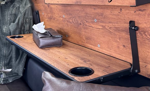 ESウィンドウパネルに取付けて使用するフリップテーブルです。ドリンクホルダーが2箇所設置しているため2人での使用も可能です。テーブルを使用しない時は折り畳んで収納できるので、外す必要もなく、ESフリップベッドに干渉することなくベッドマットを跳ね上げることが可能です。ES TXウィンドウパネルと同じメラミン化粧板仕様です。