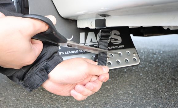 フロントとは逆にブラケットを先に取付けし、そのブラケットも使いマッドガードを取付けします。その後ベルトを固定します。ベルトが長い場合はカットして、カットした先端はほつれ防止のためにあぶっておきます。