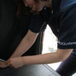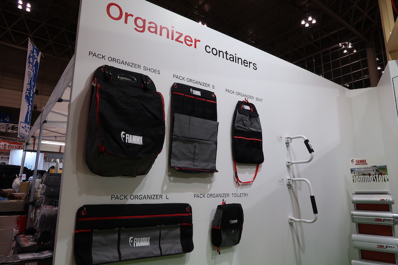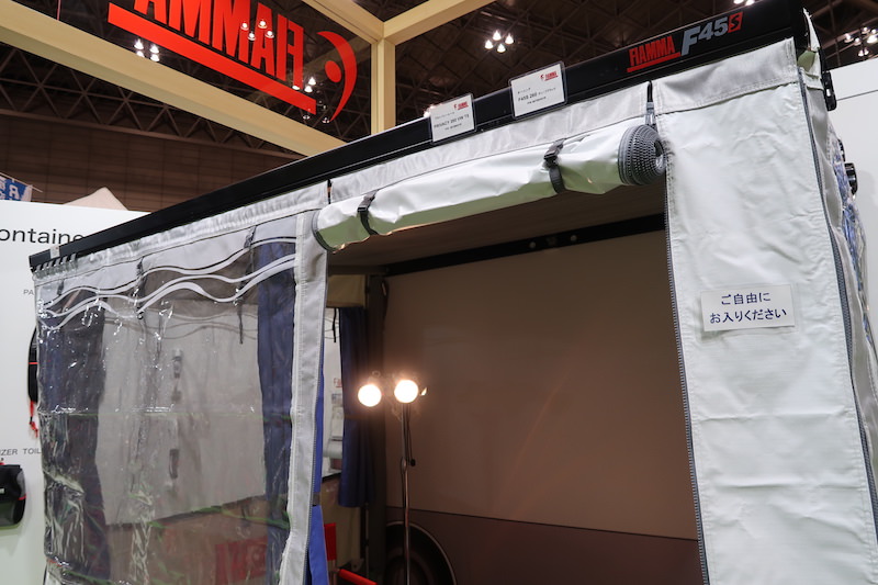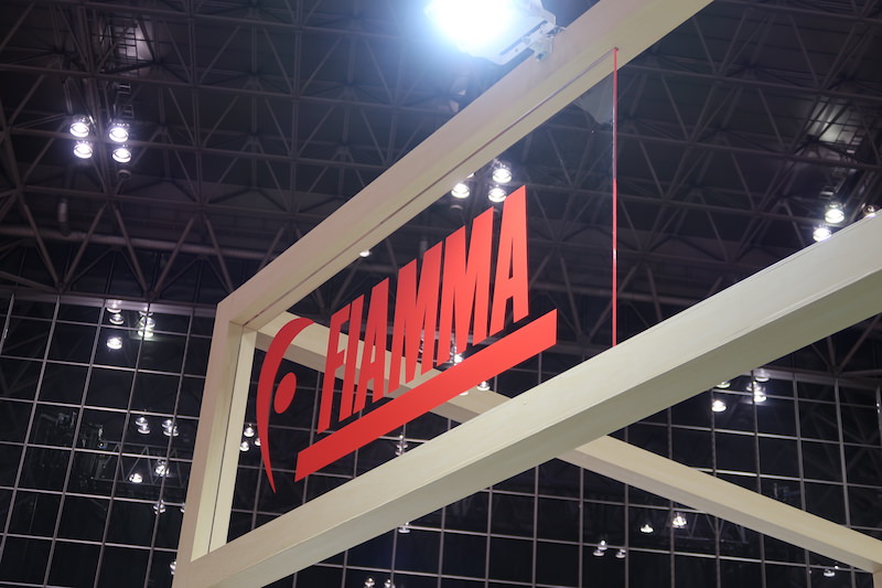 ジャパンキャンピングカーショー2018レポート」。次は、オーニングやキャリア、収納グッズまで、トランポをより快適にするアイテムを多数ラインナップしているFIAMMA(フィアマ)ブースです。