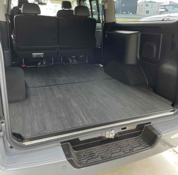 お買い上げいただいたお客様より、装着後のお写真をいただきました。ありがとうございます。床がフラットになることで遊び道具や荷物の積載がしやすくなるだけでなく、ベッドなどの後付けアイテムも安定します。