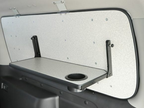 ESウィンドウパネルのオプションパーツで、工具不要でノブボルトだけで固定できるテーブルです。車中泊や休憩時など、ベッドを使用する際に飲み物やスマートフォンなどの小物を置くスペースとして最適です。カップホルダーが1個装備されており、未使用時は跳ね上げて収納できるフリップタイプです。1人で使用したり、ちょっとした物などを置くのにちょうどいいサイズです。