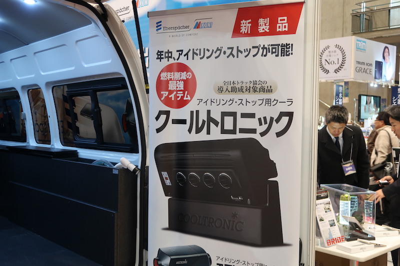 デモカーには参考出品のクールトロニックが装着されていました。これは、車載のエアコンとは別の独立したシステムで、アイドリング・ストップ時に車載バッテリーで電動コンプレッサを動かすクーラです。