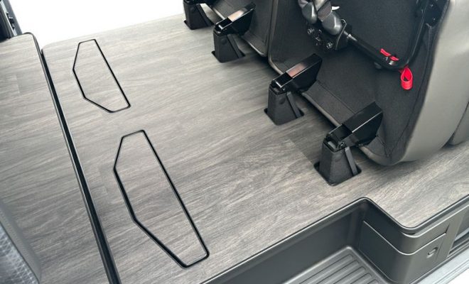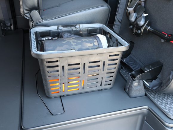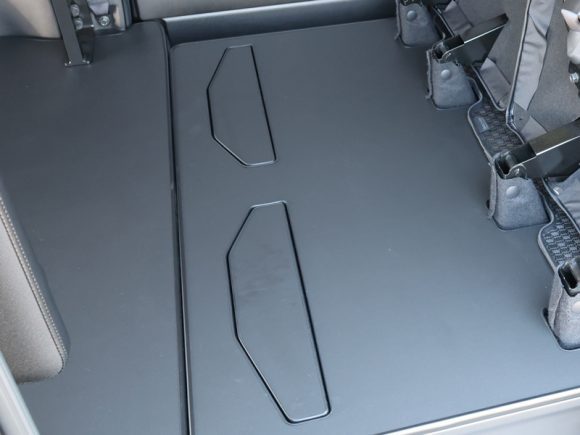 ESフロアパネル(F)には純正セカンドシート用のシートキャッチに合わせてくり抜き加工が施されている為、車中泊を行う際にセカンドシートを跳ね上げて荷室から行き来する方や、セカンドシートのスペースを活用して荷物を積載する際にシートキャッチ穴部分が気になってしまう方にオススメなアイテムです。