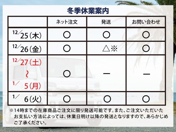 ぜひ連休前にもオグショーオフィシャルネットストアをご利用いただき、連休中の理想のトランポ作りをサポートさせていただければと思います。また、商品によっては、ご注文のタイミングにより休業日明け以降の発送となる場合もありますので、商品の納期など気になる方は、ご注文前にお問い合わせください。