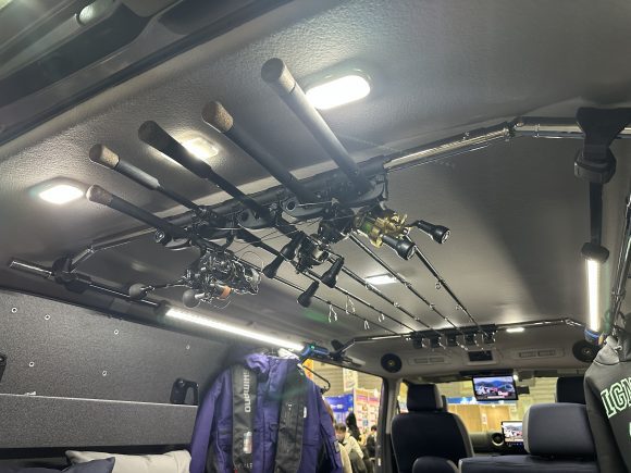 室内には釣りと相性ぴったりなESフリップベッドワンサードや、釣り仕様には欠かせないESロッドアタッチメントなどがカスタムされています!もちろんESフロアパネル等もオグショー通販にてお買い求めいただけます。さらに、奥田さん愛用のフィッシングギアも積載させていただきました!