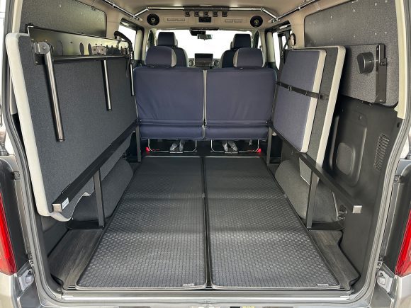 すべて自社縫製で仕上げ、国内生産にこだわっているオグショーオリジナルシートカバー。こちらも特別仕様でベッドの生地と同じものを使用し、統一感を出しています。取付けるだけで車内の雰囲気が変わり、シートの汚れ防止にも役立ちます。