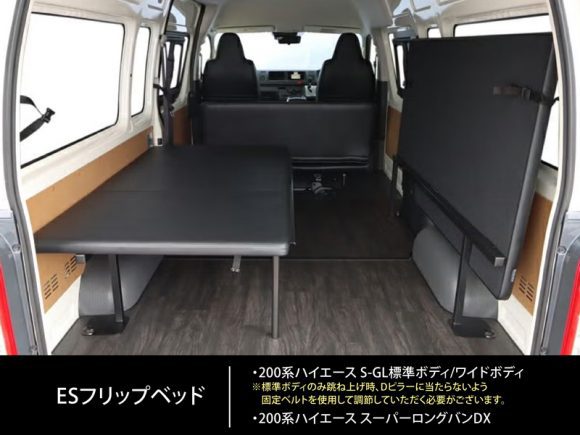 ※ESフリップベッドにつきましては、標準ボディのみ助手席側Dピラーに当たらないよう、固定用ベルトを調節していただき、お取付けいただければと思います。