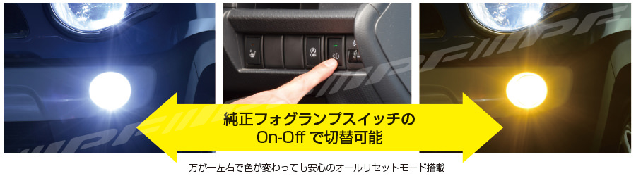 純正フォグランプスイッチで簡単に発光色の切り替えが可能