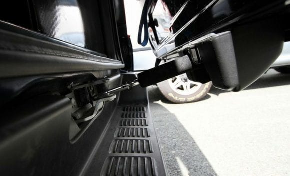 適合:200系ハイエース、100系ハイエース(バックドアのみ装着可能)(※スライドドアはボーンバーを装着したままでキーロックができません。※その他の車種の場合はお問い合わせください)