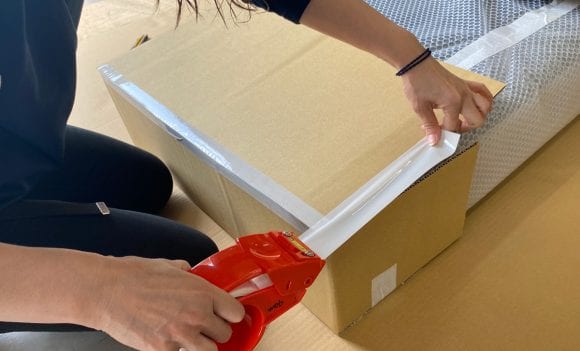 まず、左右のボックスを梱包していきます。ボックスサイズに合わせた専用のダンボールケースに入れて梱包します。輸送時に傷がつかないよう、特にアルミコーナー部分を中心にプチプチやダンボールで保護してから梱包しています。