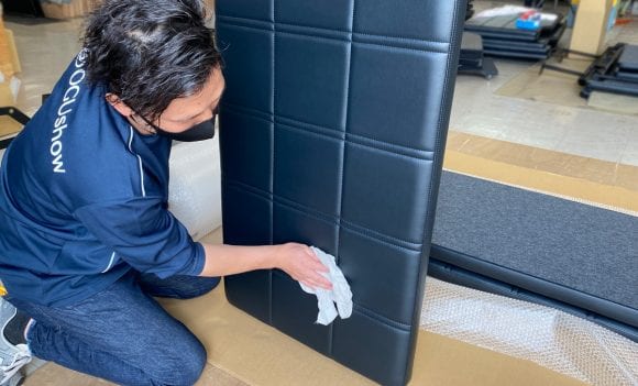 このベッドキットのマットは、サイドマットが左右で計4枚、センターマットが3枚の、合計7枚のマットで構成されています。マットは一枚一枚、表面に傷などがないか、品質のチェックしながら表面を綺麗に拭き上げていきます。