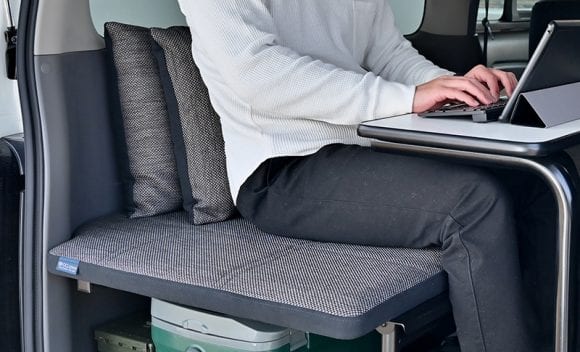 クッションの表面がESモビリティコンセプト専用ファブリック生地、裏面がブラックモケット生地のコンビ仕様になります。車内でリラックスする時や、就寝時の枕として使用していただけます。