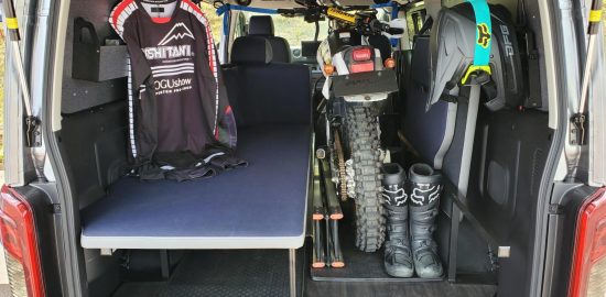 今回は、全日本トライアル選手権で展示した「車中泊×トランポ仕様」キャラバンに装着していたES フリップベッド ワンサードのご紹介をさせていただきます。運転席側のベッドマットは、半分が跳ね上げ式、半分が取り外し可能な構造。…