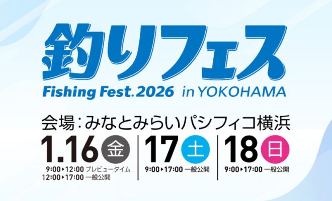2026年1月16日(金) ~ 18日(日)にすべての釣りファンが注目する釣り業界最大級のイベント『釣りフェスティバル in Yokohama』がパシフィコ横浜展示ホールにて開催されます!今年は史上最多の250超えの出展者が横浜に集…