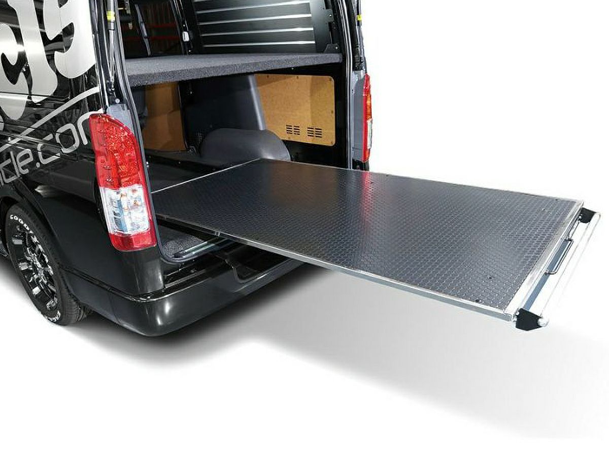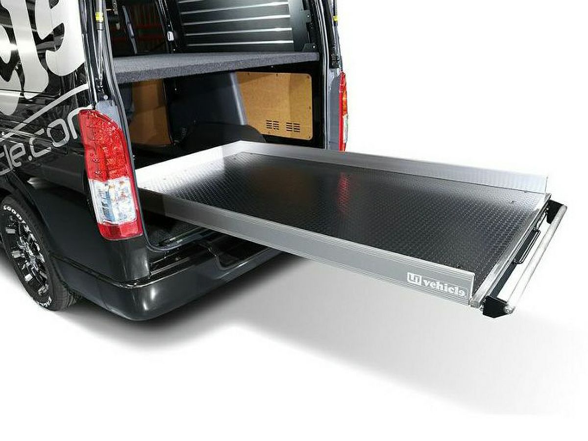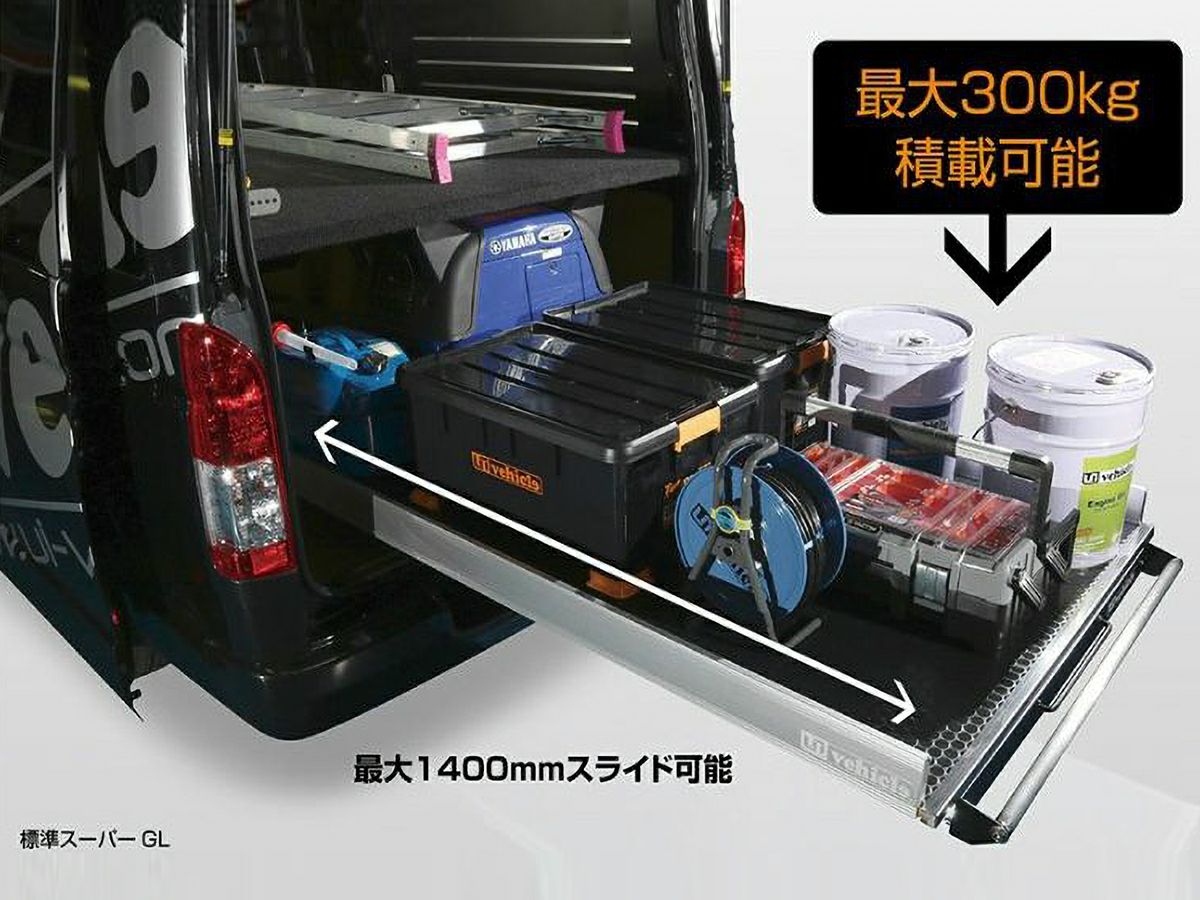 荷室奥の荷物も、このスライドフロアを設置すれば簡単に取り出すことができます。最大300kg積載可能で重量物にも対応。引き出す時はロック解除レバーを握って引っ張るだけです。出幅も4段階に固定でき、最大で1400mmスライドします。最長に引き出した時でも、脚などの支えは不要です。
