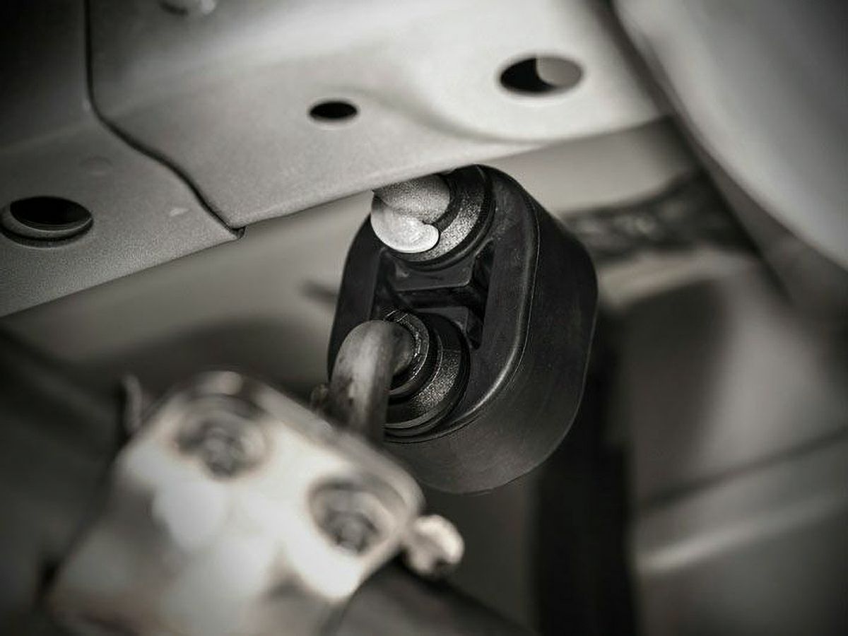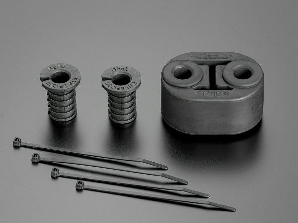 純正を上回る極厚形状が頼もしい「ハイパーマフラーハンガー」。効果的に高められたゴム硬度が走行中の振動を吸収しつつ、マフラーテールエンドをしっかり固定。