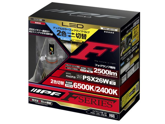 発売以来大好評の、天候に応じて発光色が変えられるフォグランプ「IPF デュアルカラーフォグランプバルブ」が進化。夜間のドライ路面では明るくファッショナブルな光を発するホワイト光(6500K)。そして悪天候時のウェット路面では視認性の高いイエロー光が、さらに濃い2400K( ケルビン) になりました。2つの理想を1本のバルブで実現したのが、この「デュアルカラーフォグランプバルブ」。従来のイエローLEDバルブでは、電球色LEDにイエロー色フィルターを組み合わせ光を合成していたため、発光色を変更したい場合はバルブ本体の交換が必要でした。それに対してこの製品は、フォグランプに最適化した2色のLEDを、IPFが誇る配光技術と新開発の切り替え制御機能を融合し、製品化しました。刻々と変化する路面の状況に応じて即座に順応する驚きの2色切り替え機能をぜひご体感ください。