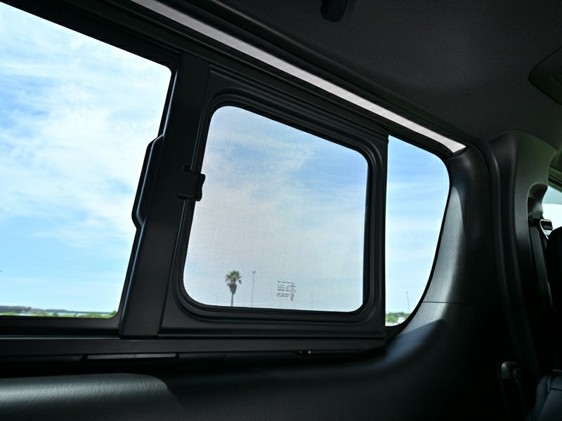 小窓に装着するこの網戸は、200系ハイエース4型以降の窓枠にピッタリはまるよう専用設計されています。しかも、取り付ける際にボディに加工は必要なく、内側から金具を使って固定するだけの簡単装着でプラスドライバー1本で固定できます。また、しっかり固定されていれば、そのまま走行が可能です。取り付けたままで窓の開閉ができるので、夜中の冷気や突然の雨などにも対応できる優れものです。もし網が破れても家庭用の網戸と同じように張り替えが可能です。