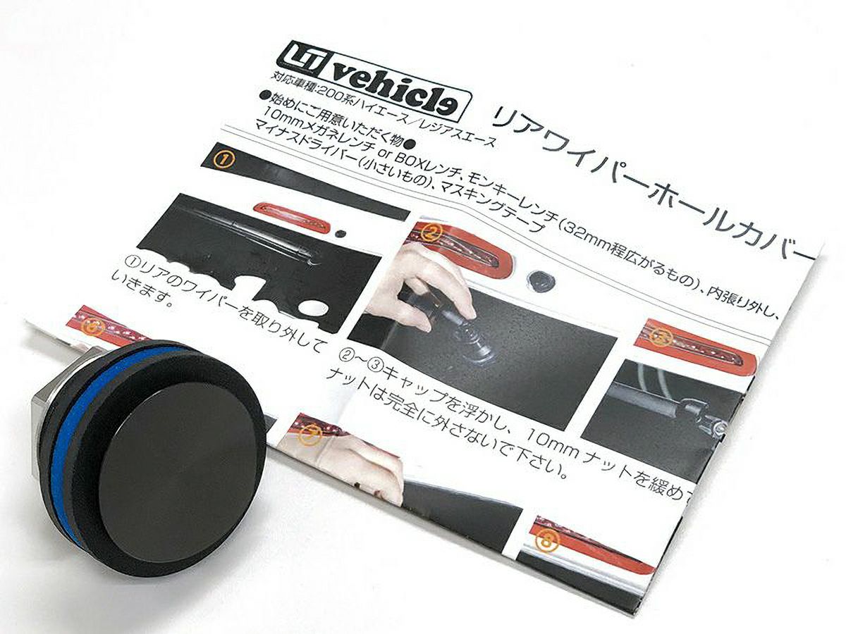 リアワイパーを外した穴をフラットに埋める、アルミ製(ブラックアルマイト)カバーです。3層パッキンを使用し、防水・浸水対策が施されています。