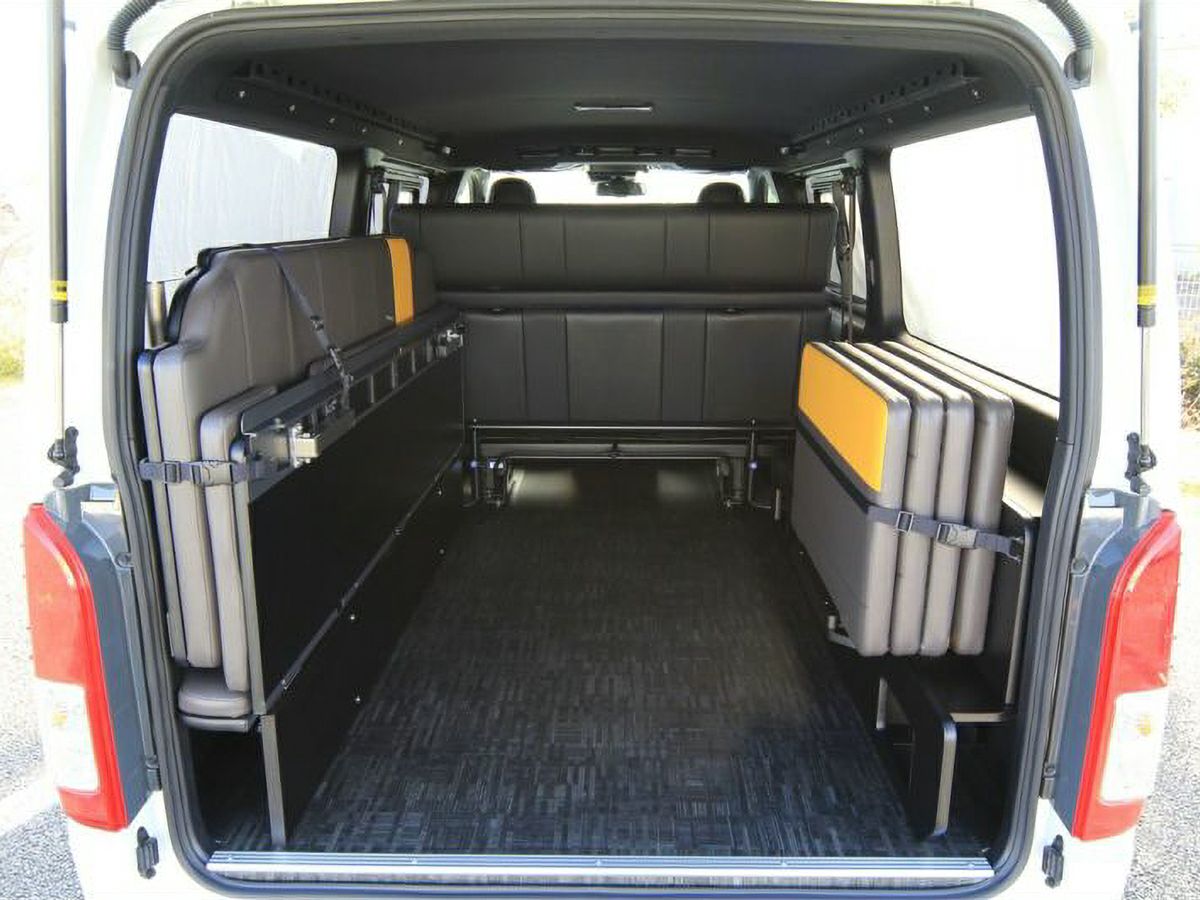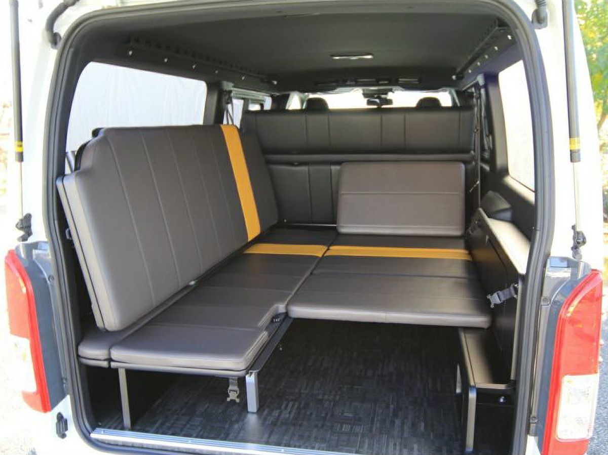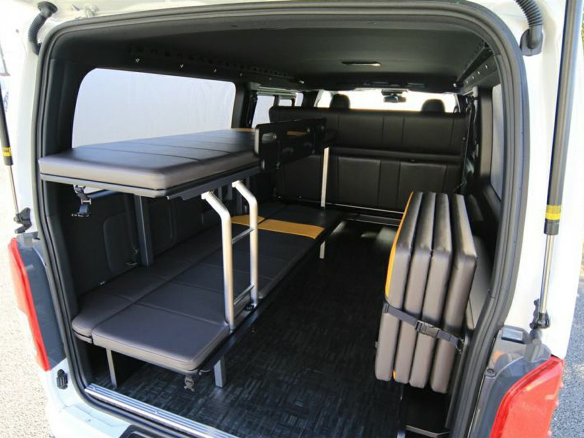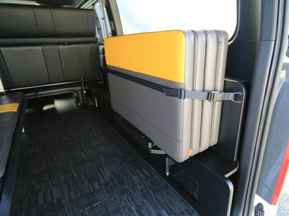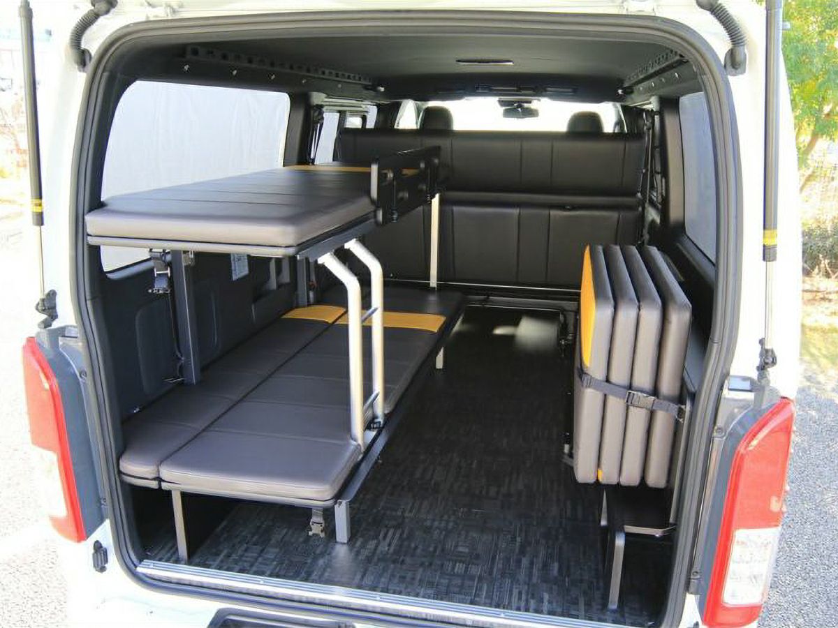 ベッドを格納すれば、広々としたカーゴスペースに。 趣味の道具を多く積むことを前提に設計。これぞ、トランポ専門店が提案するベッドキットです。2段ベッドも純正のボルト穴を利用して固定します。