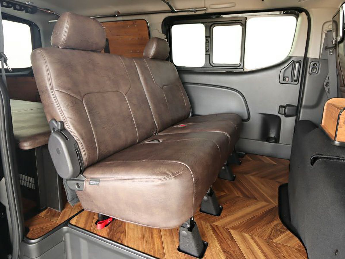 3型キャラバンの純正シートウレタン形状やデザインをバックアップし、新しくデザインや形状を一新したシートカバー。表皮には耐久性・耐水性に優れ、ビンテージ感を演出した質感のPVCレザーを採用しています。