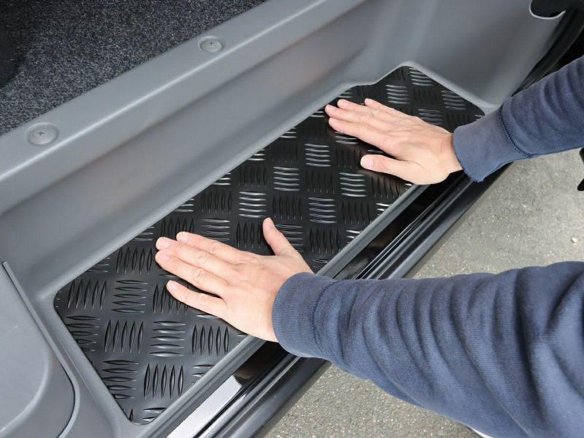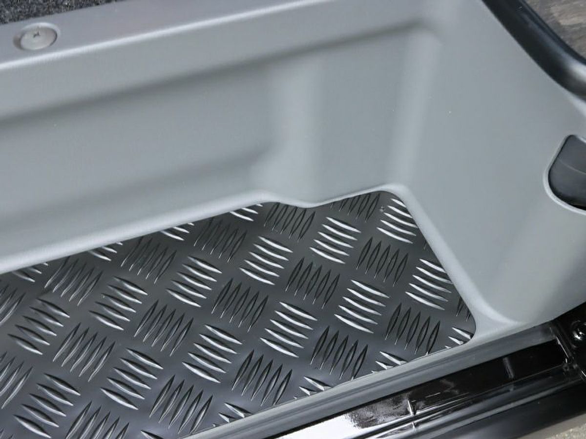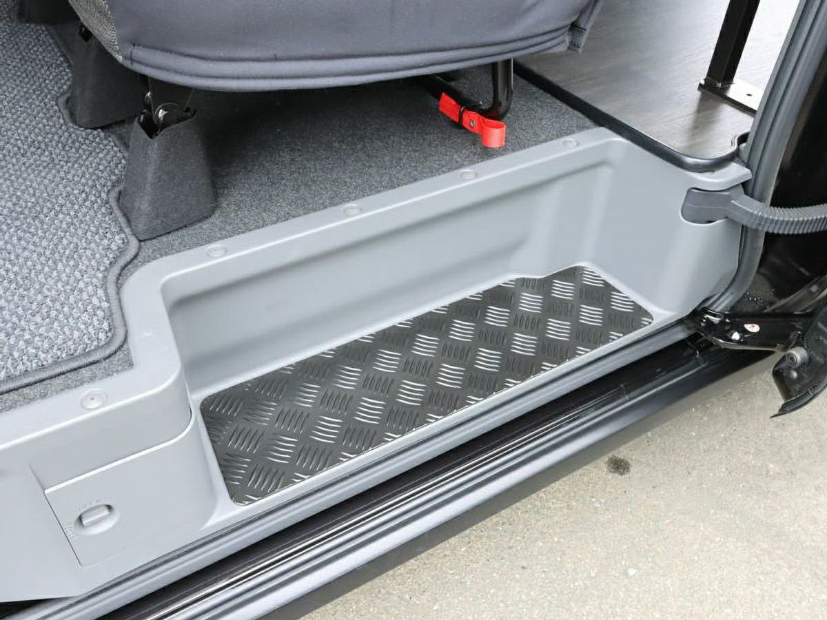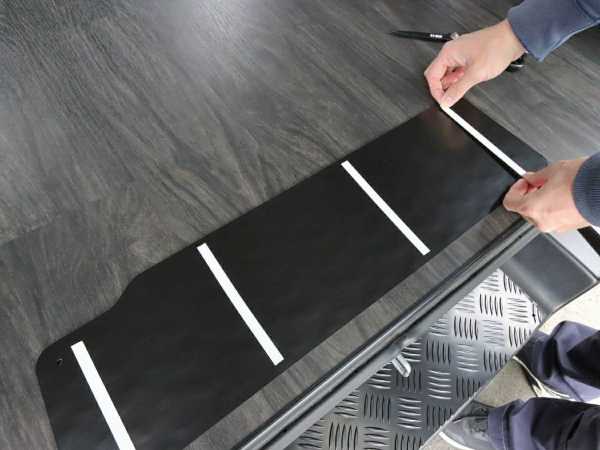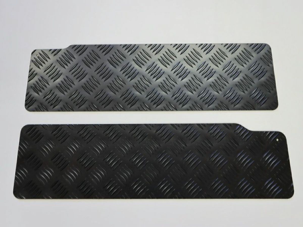 縞鋼板の特徴は滑りにくさであり、ステップが水で濡れたり、泥で汚れたりした場合でも縞目の突起が滑り止めの役割を果たしてくれます。さらに、耐久性を高めるために防錆性能にも優れたカチオン塗装を施工したアルミ製縞鋼板のステッププロテクターです。