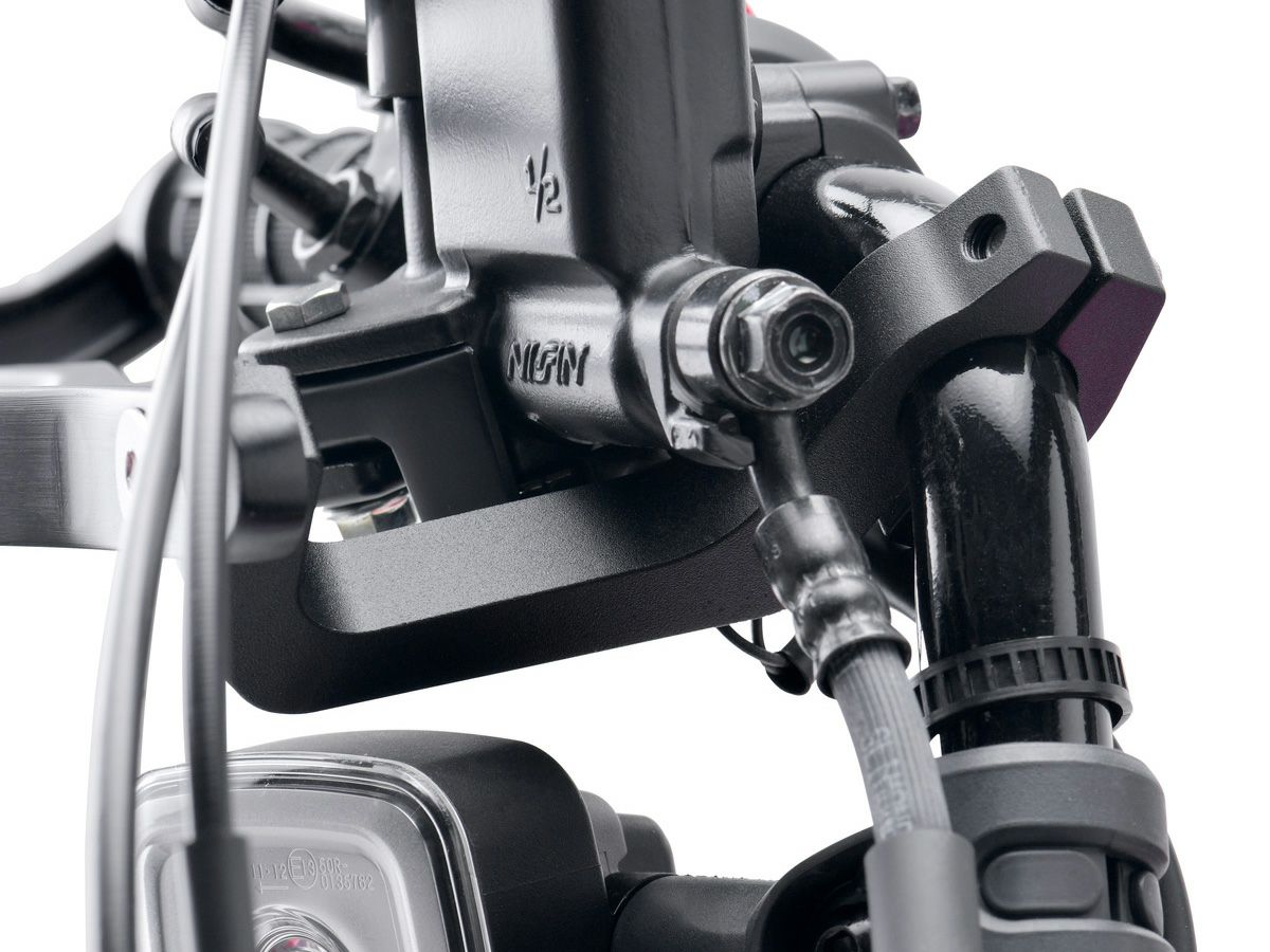 CT125ハンターカブ専用アルミハンドガードです。オフロード走行にも耐えうる高剛性アルミ合金を採用し、ハンドルクランプを専用形状とすることにより、ワイヤー類の干渉を回避しています。また、専用バーエンドを付属することで、純正インナーウエイトを取り外すことなく装着可能です。