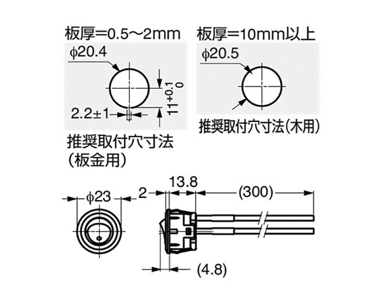 わずか23mm径のコンパクトさで場所を取らない埋込み型ロッカースイッチです。φ20.5の穴をあけ、押込むだけの簡単スナップイン取付け。30cmほどのコードも付いて配線も楽々。目立たずスペースを取らないので取付け場所に困りません。