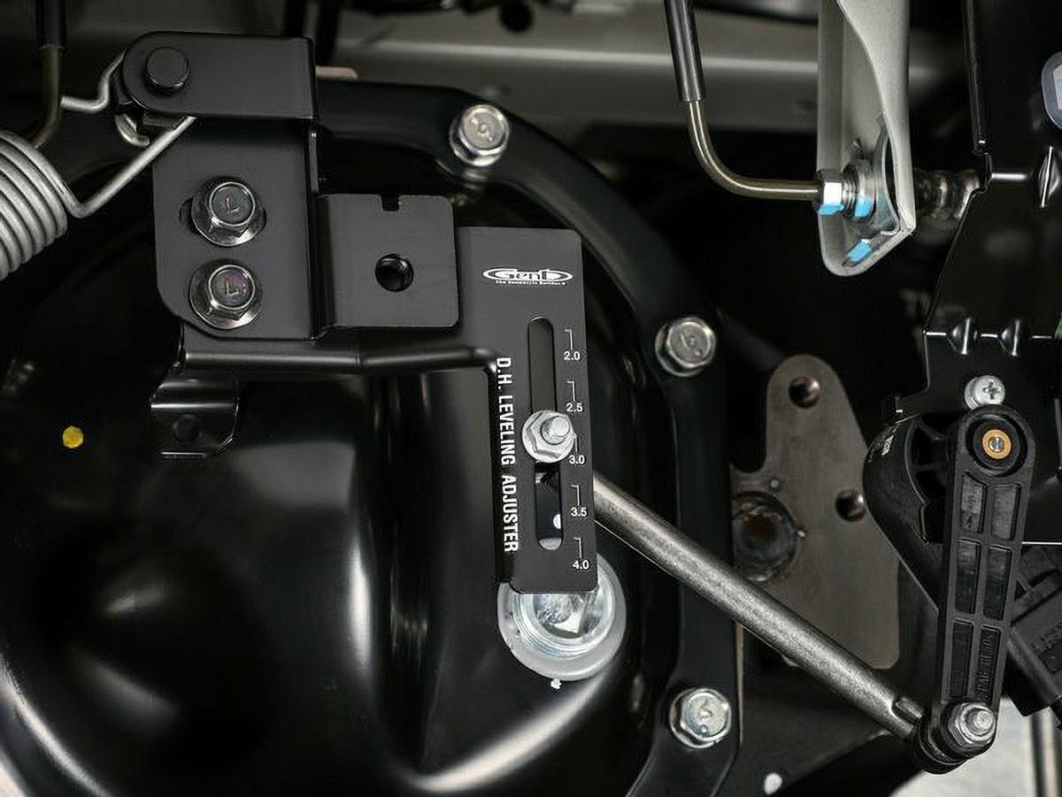 「オートレベリング機能付バイキセノンヘッドランプ」により、ローダウンした場合にある問題が発生します。それは、後輪軸に設置されているハイトコントロールセンサーが荷重による車体後部の沈み込みとして感知し、光軸を自動的に下向きに調整してしまうのです。「O.H.レベリングアジャスター」は、センサーリンクをダウン量に応じた位置に移動することで、下がった光軸を正常な高さへと補正するアイテムです。