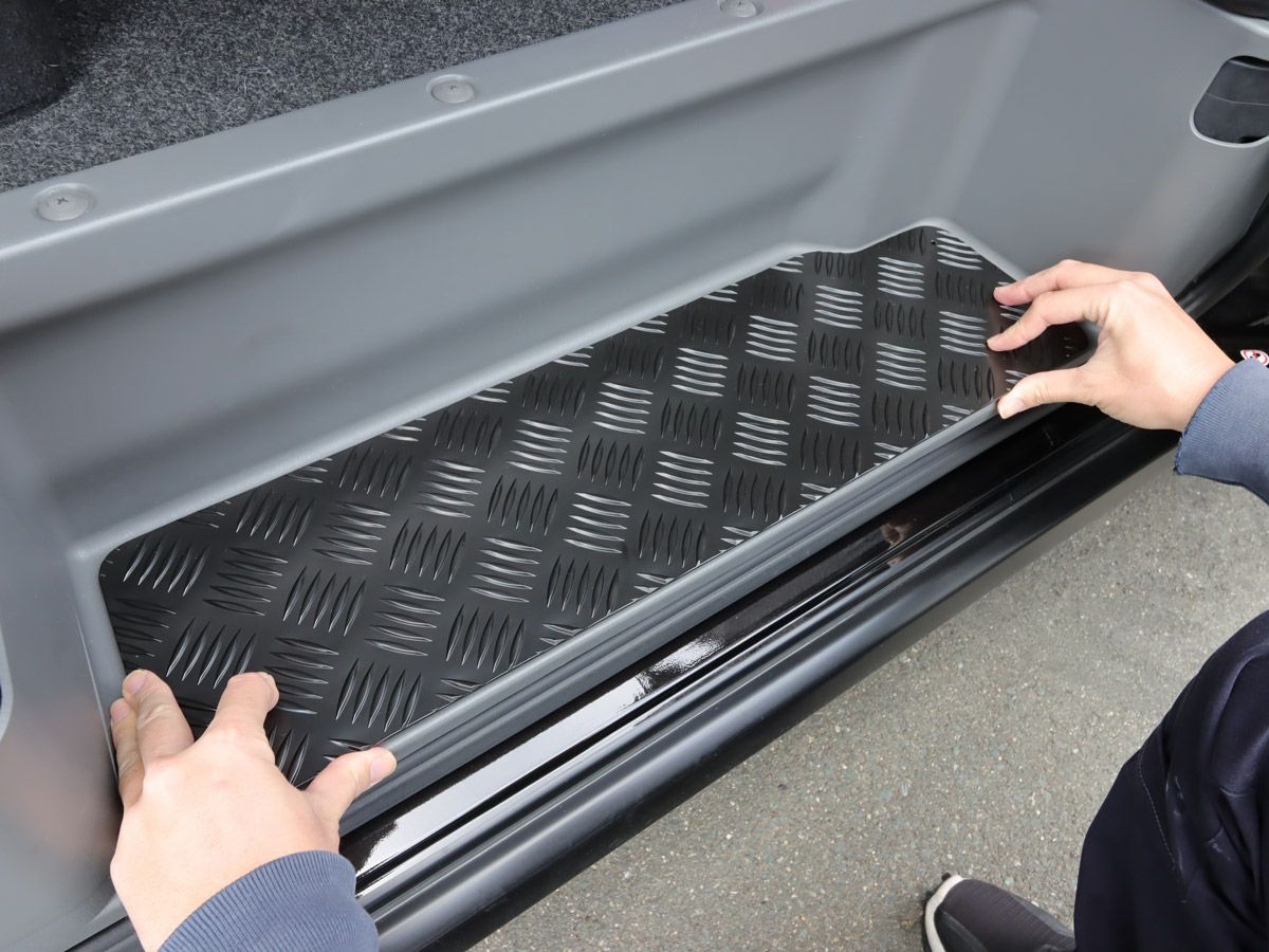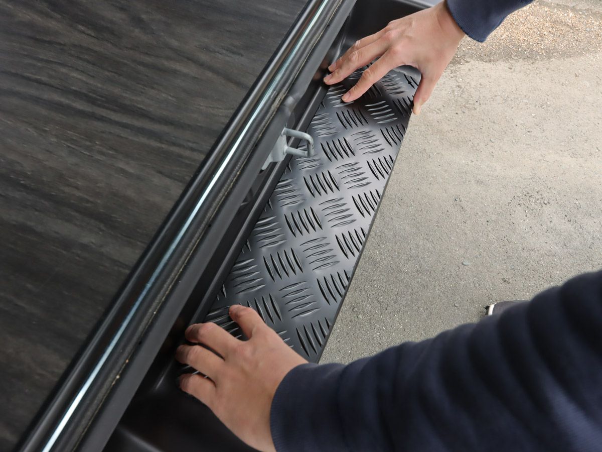 縞鋼板の特徴は滑りにくさであり、ステップが水で濡れたり、泥で汚れたりした場合でも縞目の突起が滑り止めの役割を果たしてくれます。さらに、耐久性を高めるために防錆性能にも優れたカチオン塗装を施工したアルミ製縞鋼板のステッププロテクターです。