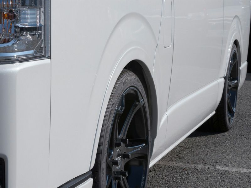 出幅はフロント・リアともに6mm。 さらに20mmダウンフェンダーのため、ローダウンの視覚効果もあります。フロント4ピース・リア2ピースの6ピース構成で、取り付けは両面テープ・ビス&ステー留めになります。