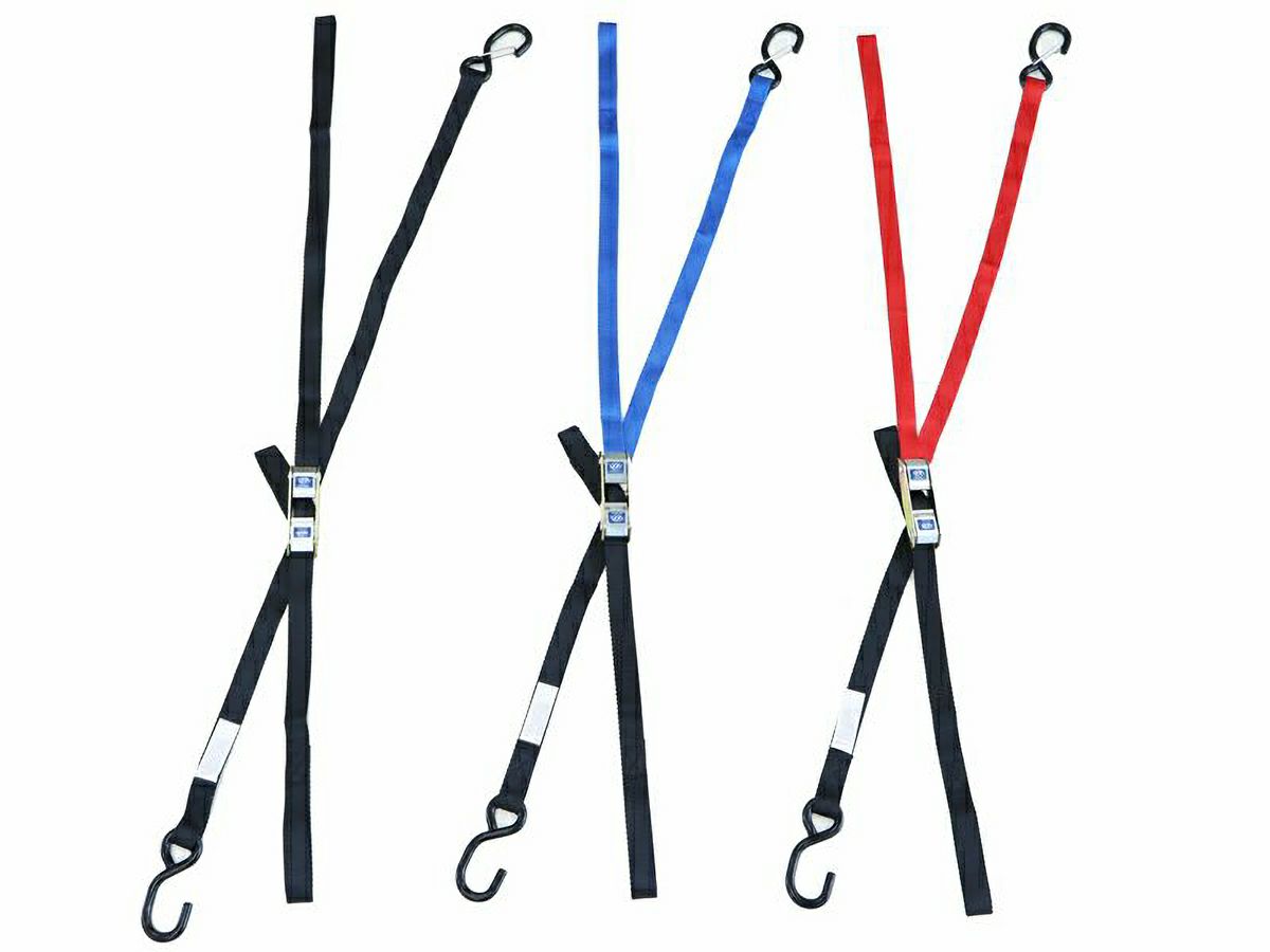 バイクをトランポに積み込む際、輸送中に転倒しないように安全にタイダウンベルトでバイクを固定する必要があります。「ES 2WAYタイダウンベルト」は、2WAYバックルを採用したことで左右(上下)どちらからも引くことができ、サブベルトも一体化させた使い勝手抜群なオグショーオリジナルのタイダウンベルトです。