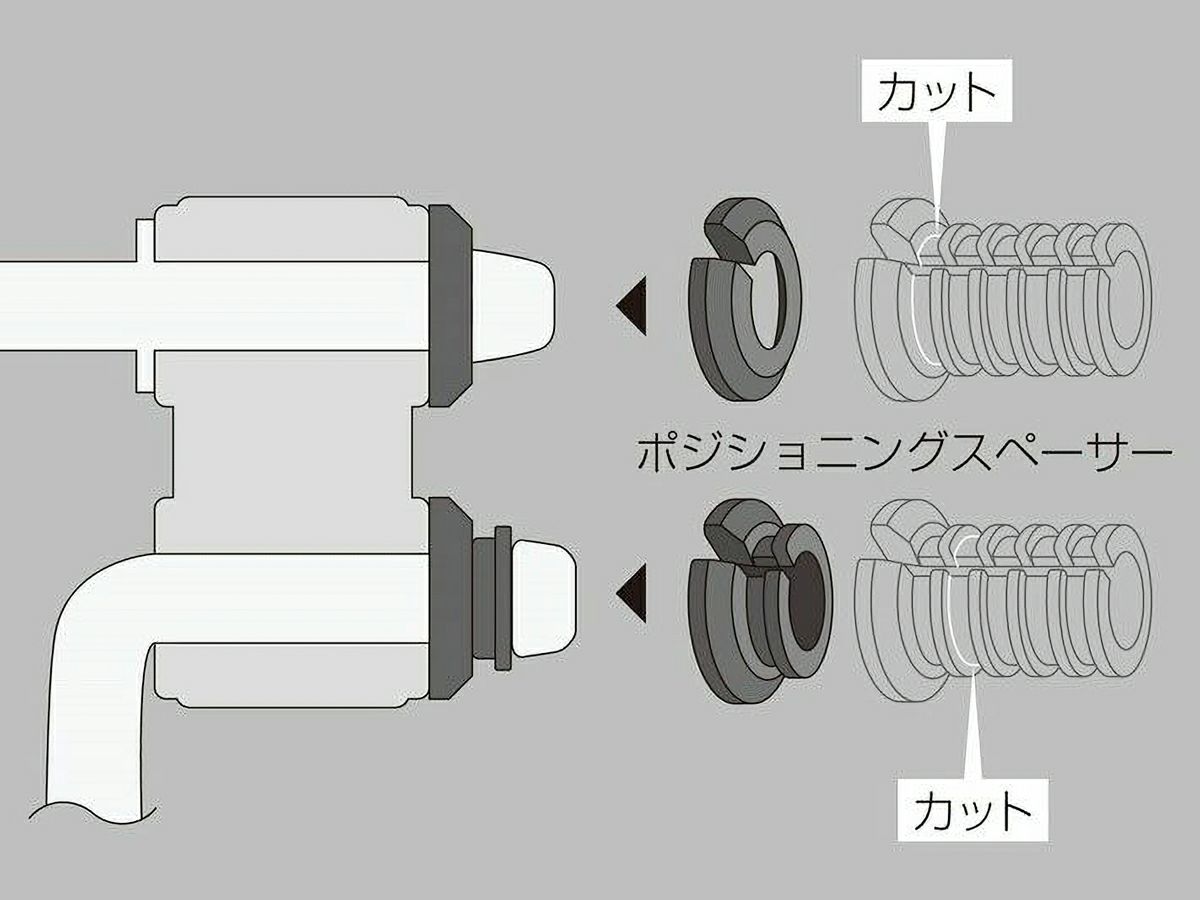 ポジショニングスペーサーを任意のサイズにカット。マフラーリングの動きを遮るようにマフラーフックの空スペースへ装着するだけでセット完了。