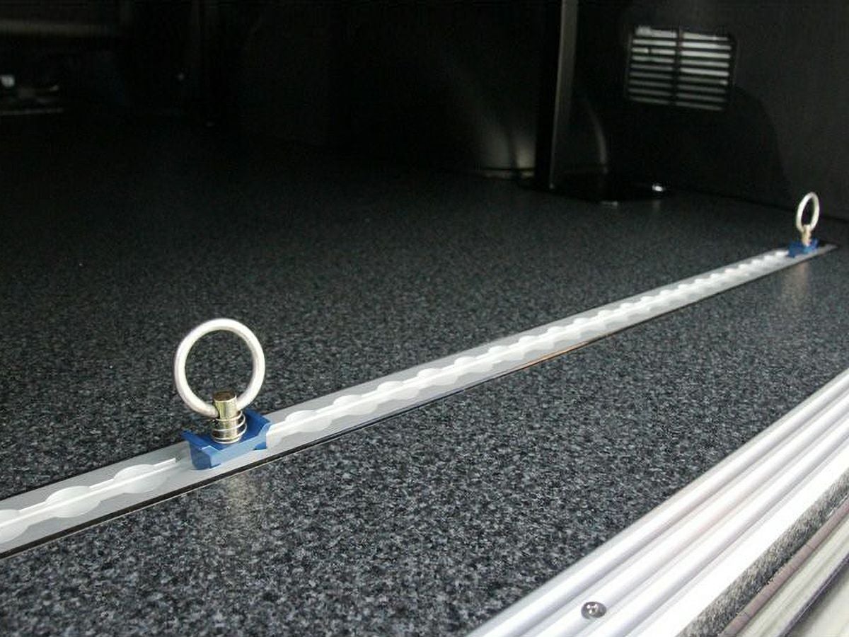 荷室の鉄板部分などにタッピングビスやボルト&ナットでレールを固定すれば、欲しいときに欲しいところへ別売りのワンタッチリングを取り付けて、ベルトなどで荷物を固定することができるようになります。