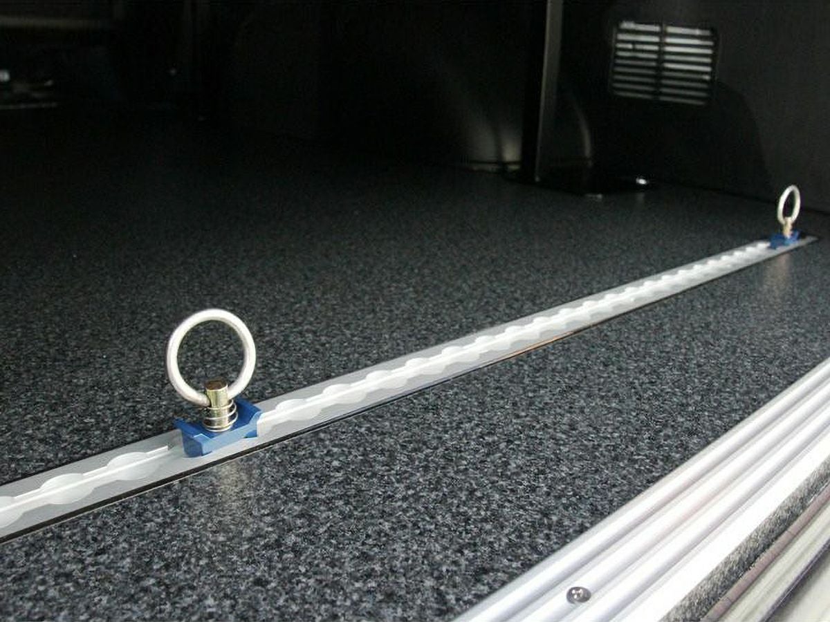 荷室の鉄板部分などにタッピングビスやボルト&ナットでレールを固定すれば、欲しいときに欲しいところへ別売りのワンタッチリングを取り付けて、ベルトなどで荷物を固定することができるようになります。